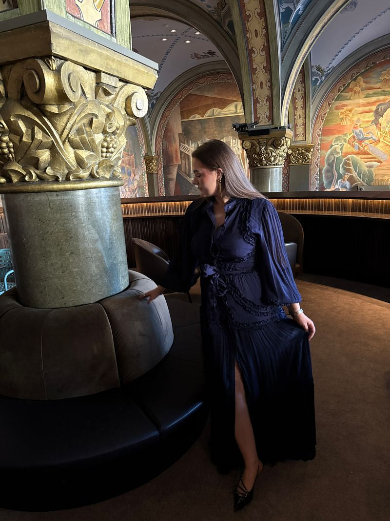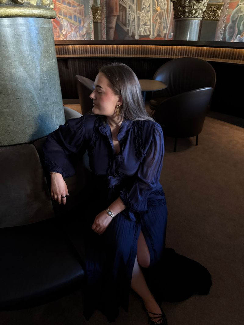 Violetta Maxi Dress fra Love Lolina er en elegant og tidløs kjole i mørk blå, perfekt for høstens festlige anledninger. Med sine delikate, semitransparente volumermer tilfører den et romantisk preg, mens den markerte midjen og medfølgende belte skaper en flatterende silhuett. Den lange, flytende passformen gir et sofistikert uttrykk, enten du skal i bryllup, på selskap eller en eksklusiv middag. Style Violetta Maxi Dress med hæler og lekre smykker for en elegant look, eller kombiner den med en klassisk kåpe for en perfekt høststyling.