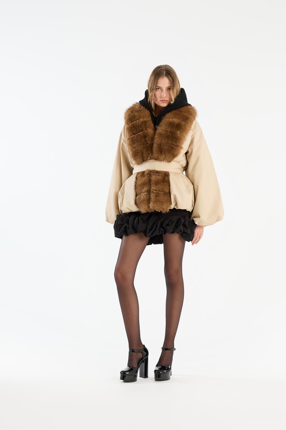 Faux Fur Collar Jacket fra Rotate er en statement-jakke med oversized passform, ballongermer og brede partier i myk fuskepels langs kragen og i front. Jakken har belte i livet, skjult hette og markerte skuldre som gir en strukturert silhuett. Faux Fur Collar Jacket fra Rotate gir en kul balanse mellom voluminøs form og elegante detaljer, og er perfekt å style både over kjoler og med jeans for en casual, men iøynefallende look. Et blikkfang av en jakke som løfter hele antrekket.