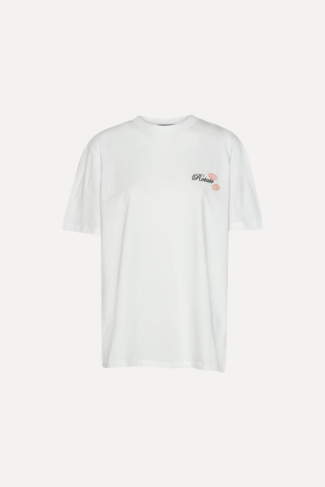 Oversized T-Shirt fra Rotate er en klassisk hvit t-skjorte med en avslappet og moderne passform. Den har korte ermer, rund hals og en liten logodetalj med kyssemerker på brystet som gir et lekent og feminint uttrykk. Oversized T-Shirt fra Rotate er laget i myk bomull og passer perfekt både til hverdags med jeans eller skinnbukser, og som en kul kontrast til mer pyntede plagg. Et allsidig baseplagg med det lille ekstra.