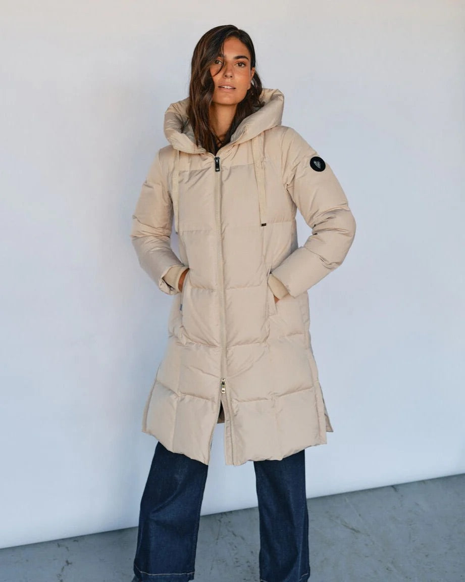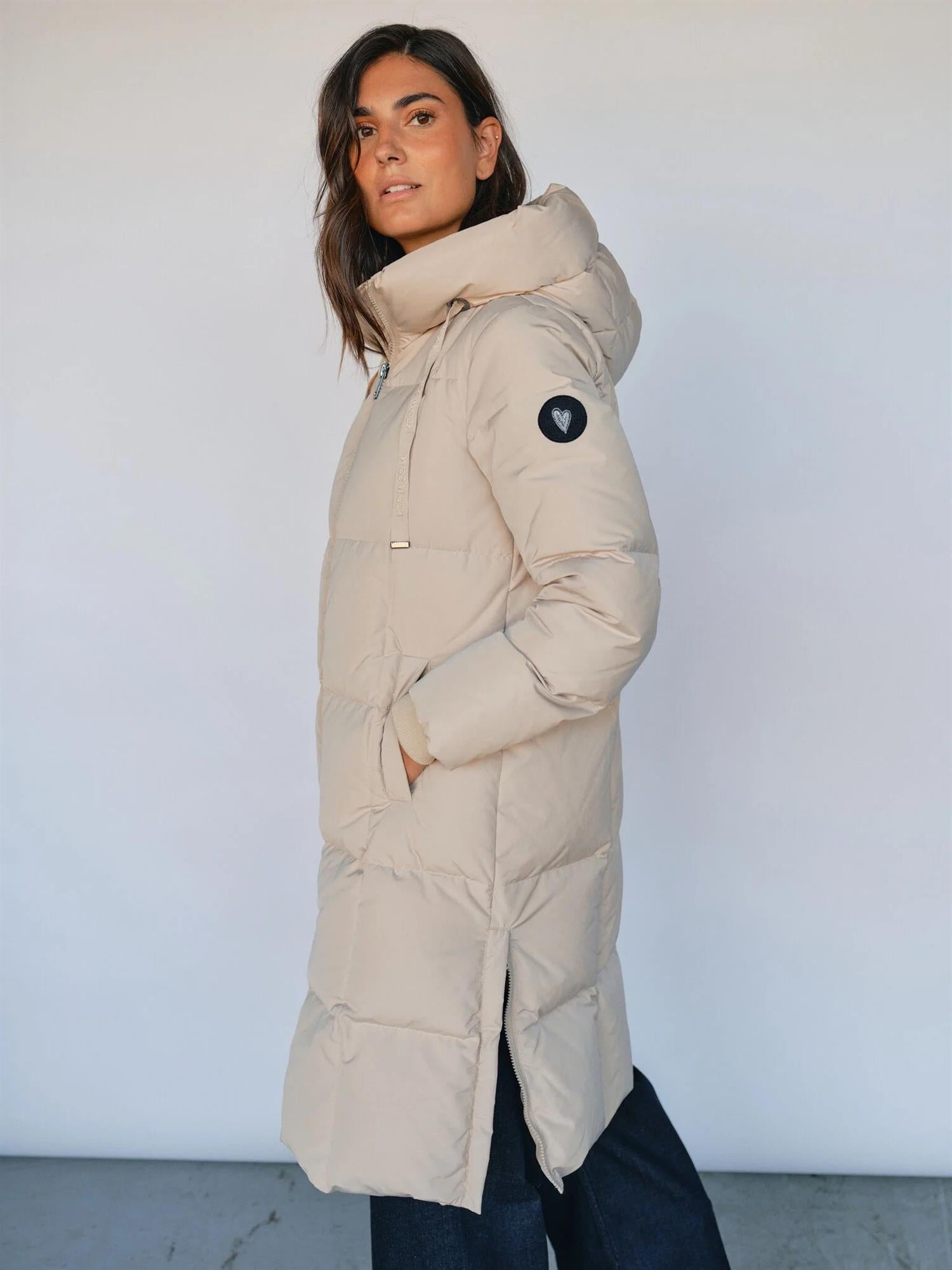 Modellen er 177 cm høy og har på størrelse S. MMNova Square Down Coat er normal i størrelsen