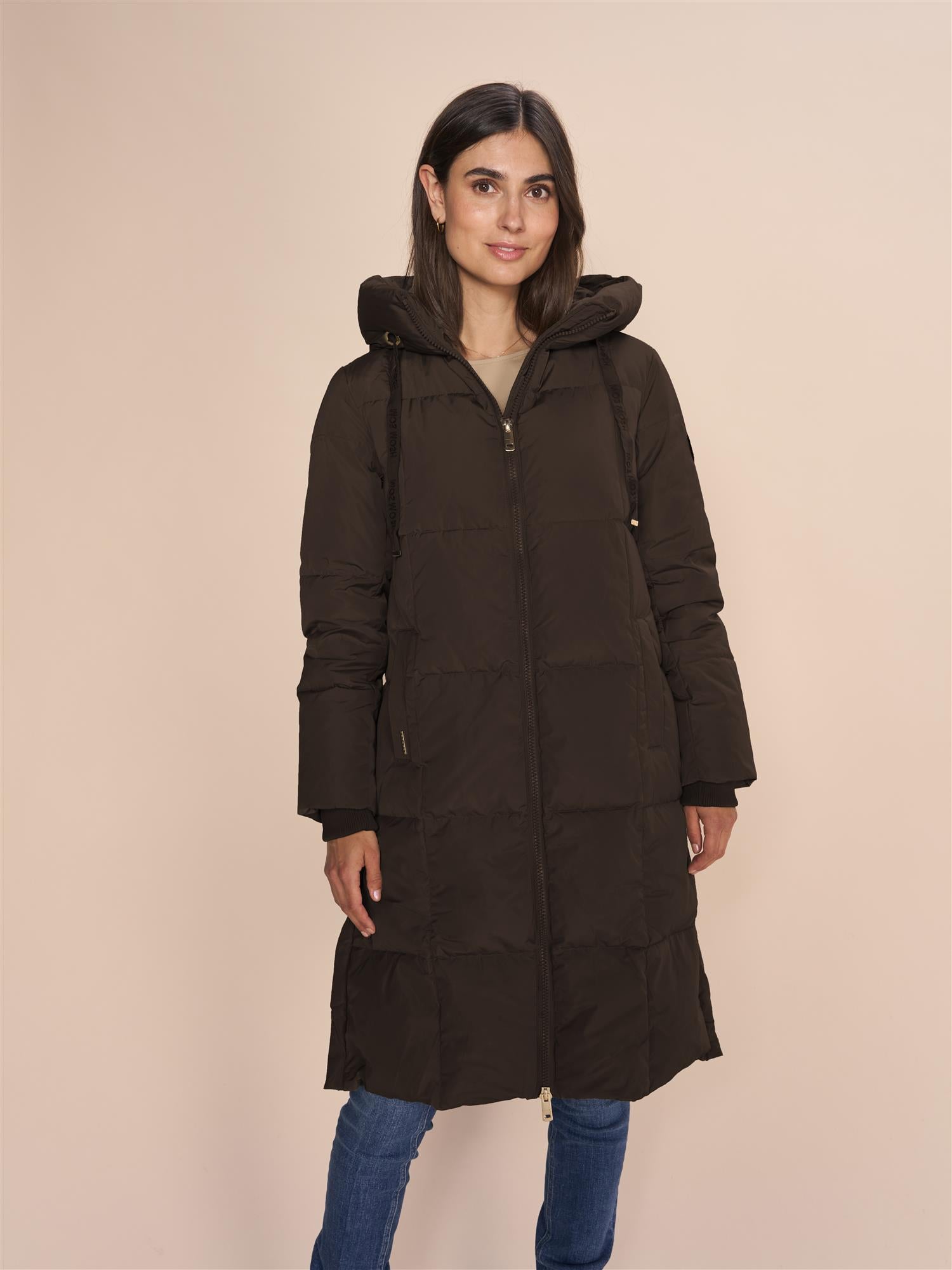 Nova down Coat har en høy praktisk krage, en deilig hette, grove glidelåser og et moderne rutemønstret quilt-design som gir et røft og kult uttrykk. MMNova Square Down Coat fra Mos Mosh er fylt med ansvarlig produsert dun og har splitter i sidene som kan åpnes og lukkes med glidelås. Dette gir god bevegelighet, enten du rusler i byen eller haster til jobb. Style den med chunky boots og lue for en funksjonell, men stilsikker vinterlook.