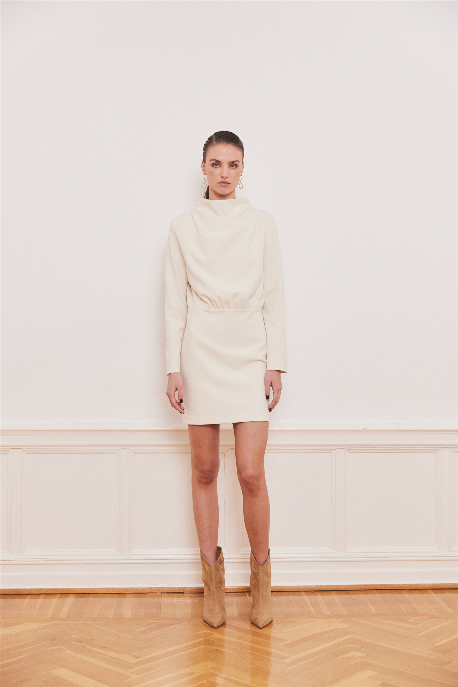Beverly Short Dress fra Iben er den perfekte minikjolen for både hverdagsbruk og en kveld ute. Den har en flatterende, kort lengde som gir en forlengende effekt på bena – nydelig med høye hæler, men like kul med sneakers eller boots. Beverly Short Dress fra Iben har en drapert, rynket høy hals og fine rynkedetaljer ved skuldrene som gir en feminin silhuett. Laget i en komfortabel viskoseblanding med skjult glidelås i ryggen, kombinerer den komfort og stil på elegant vis.