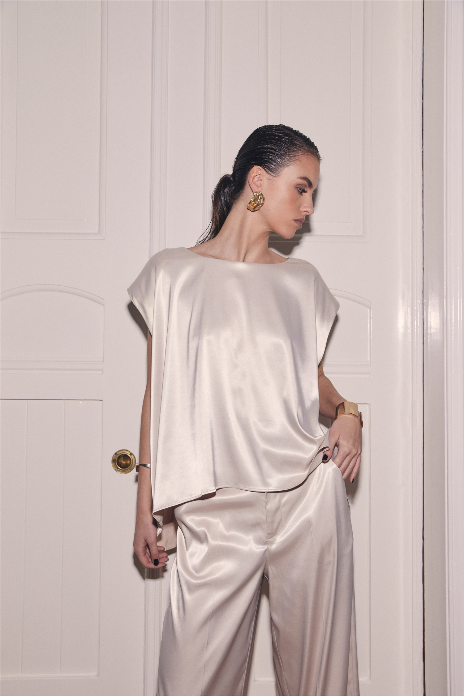Poise Satin Cape Top fra Iben er en elegant topp i kappefasong, laget i ultramykt sateng som faller vakkert og gir antrekket en sofistikert flyt. Den avslappede passformen gjør den komfortabel å bruke og enkel å style – enten du ønsker en mer oversized silhuett eller et mer tilpasset uttrykk. Poise Satin Cape Top fra Iben er det perfekte valget når du vil tilføre garderoben et touch av luksus, og passer like godt til dressbukser som til et enkelt skjørt for en elegant, men avslappet look.