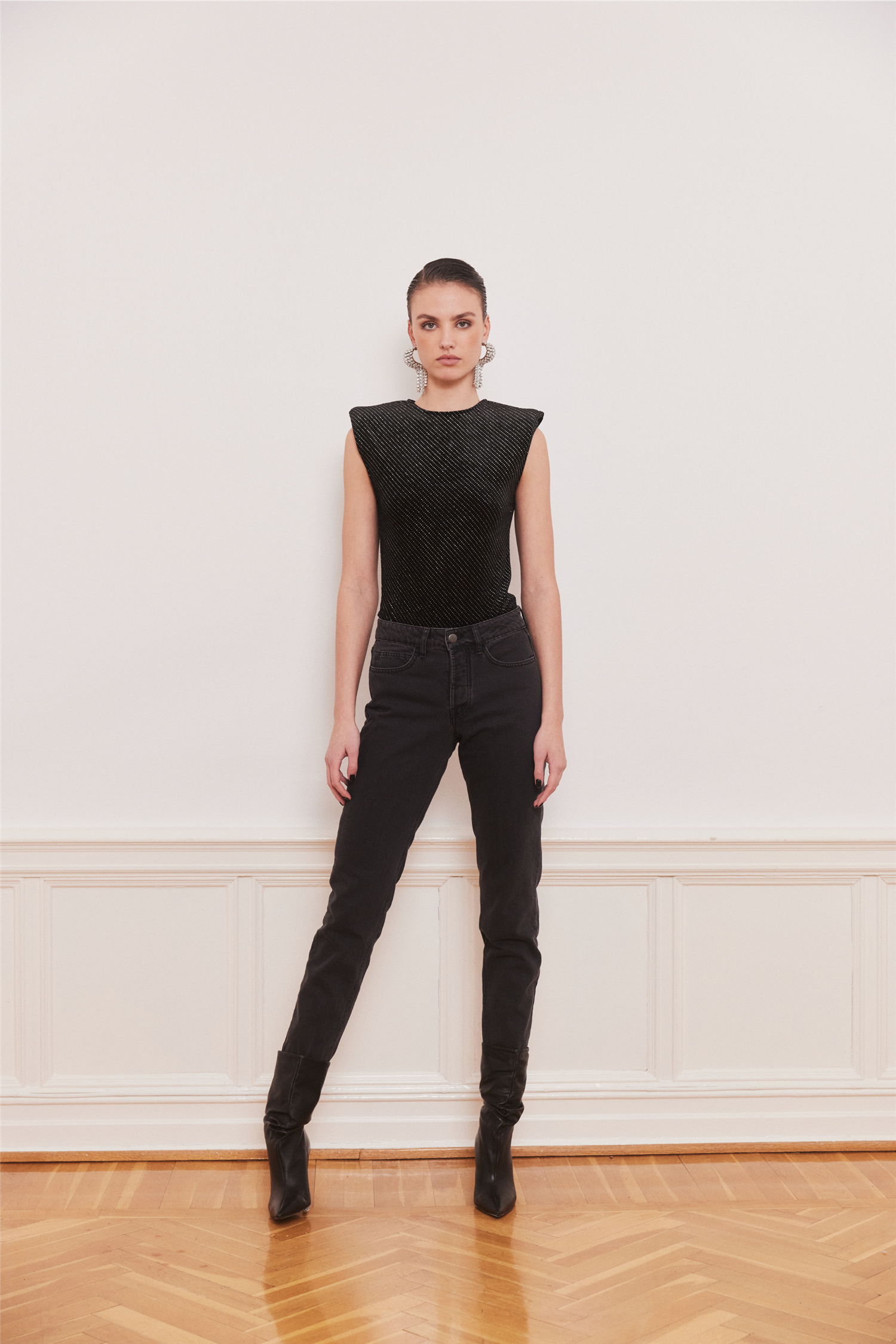 Midnight Body fra Iben er en festklar bodysuit laget i eksklusiv fløyelsjersey med paljetter og stretch som gir både komfort og en flatterende passform. Den er designet med markerte skulderputer som skaper en skarp og strukturert silhuett, perfekt for deg som ønsker et statement-plagg med bevegelsesfrihet. Midnight Body fra Iben har en smal passform og er et sesongens must-have for deg som vil løfte kveldens antrekk med stil og glans.