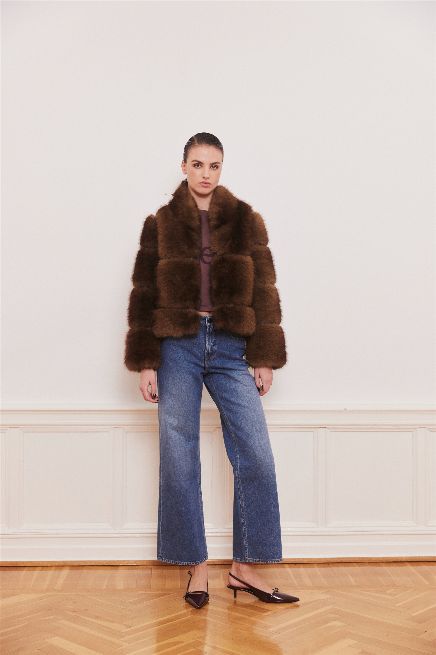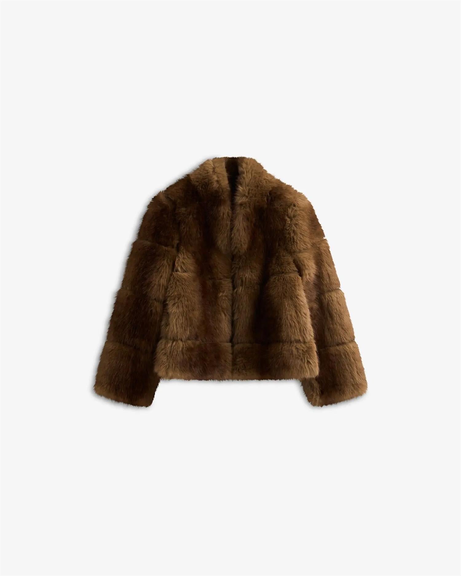Posh Short Coat fra Iben er en luksuriøs kort kåpe i høykvalitets fuskepels med en utrolig myk tekstur som gir følelsen av ekte pels. Den kommer i sesongens mest ettertraktede brunfarge og har diskré hekte-lukking i front og skjulte sidelommer som gir et rent og sofistikert uttrykk. Posh Short Coat fra Iben er det perfekte statement-plagget for vinterens festlige anledninger – varm, elegant og uimotståelig myk.