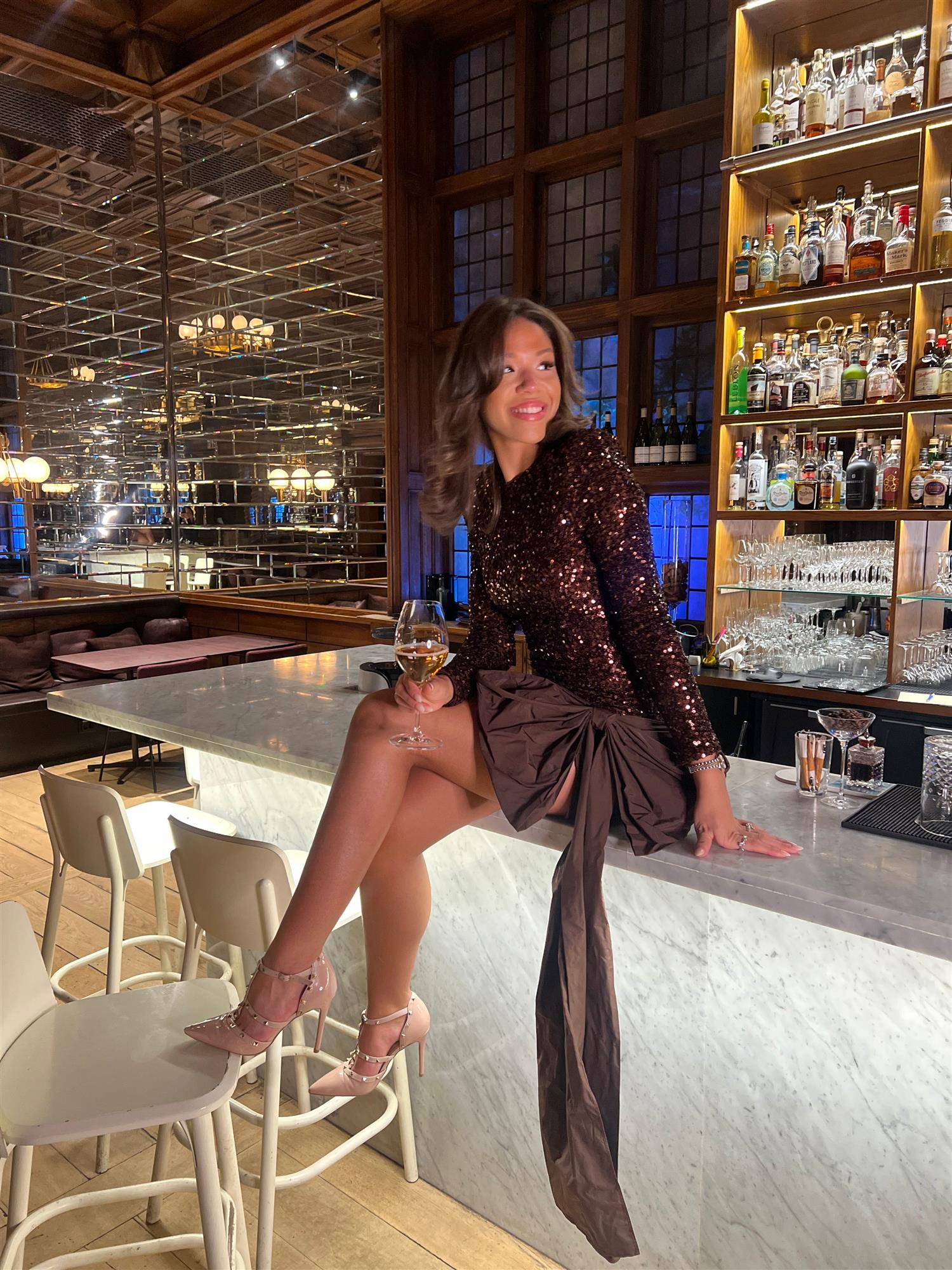 Sequins Bow Mini Dress fra Rotate er en glitrende partykjole som virkelig stjeler oppmerksomheten. Den er dekket av brune paljetter som gir et eksklusivt og luksuriøst uttrykk, kombinert med et miniskjørt i sateng med en markant drapering og stor sløyfe i siden som tilfører dramatikk og femininitet. Kjolen har lange ermer og rund hals, og sitter tett for å fremheve silhuetten. Perfekt som julekjole, nyttårskjole eller til andre festlige anledninger der du vil gjøre et uforglemmelig inntrykk. Style den med høye hæler og minimalistiske smykker for en elegant balanse til det iøynefallende designet.