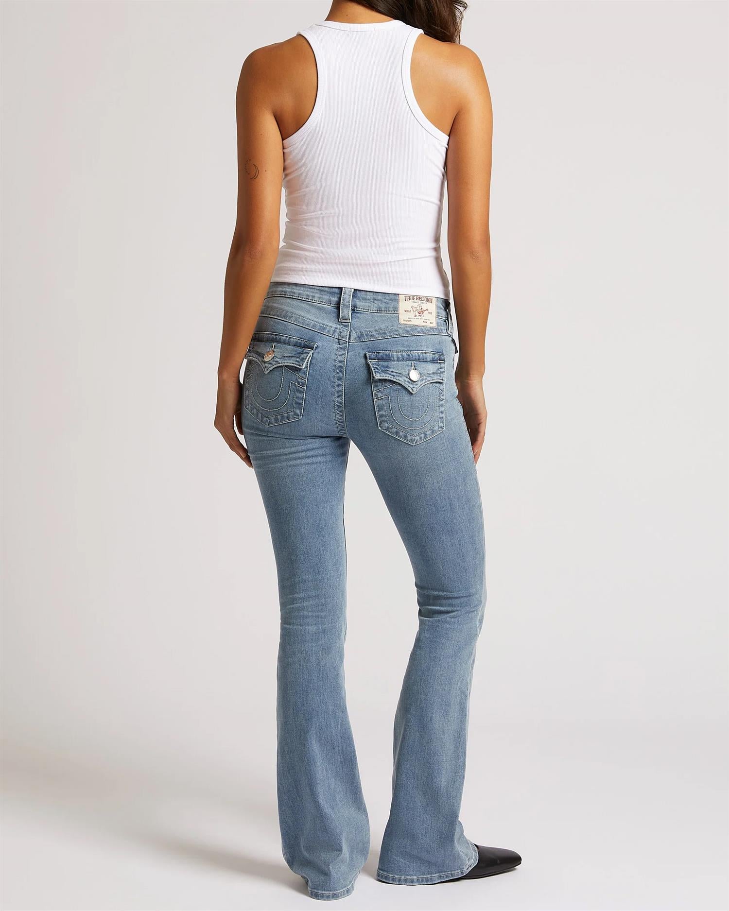 Becca Mid Rise Boot Cut Flap fra True Religion er en trendy jeans med en klassisk bootcut-fasong. Den har en mid-rise midje, en lys vask og detaljer som whiskering, beltehemper og fem lommer. Med glidelåslukking og single needle-søm gir den et raffinert uttrykk. De ikoniske hestesko-detaljene på baklommene tilfører en autentisk signaturstil.