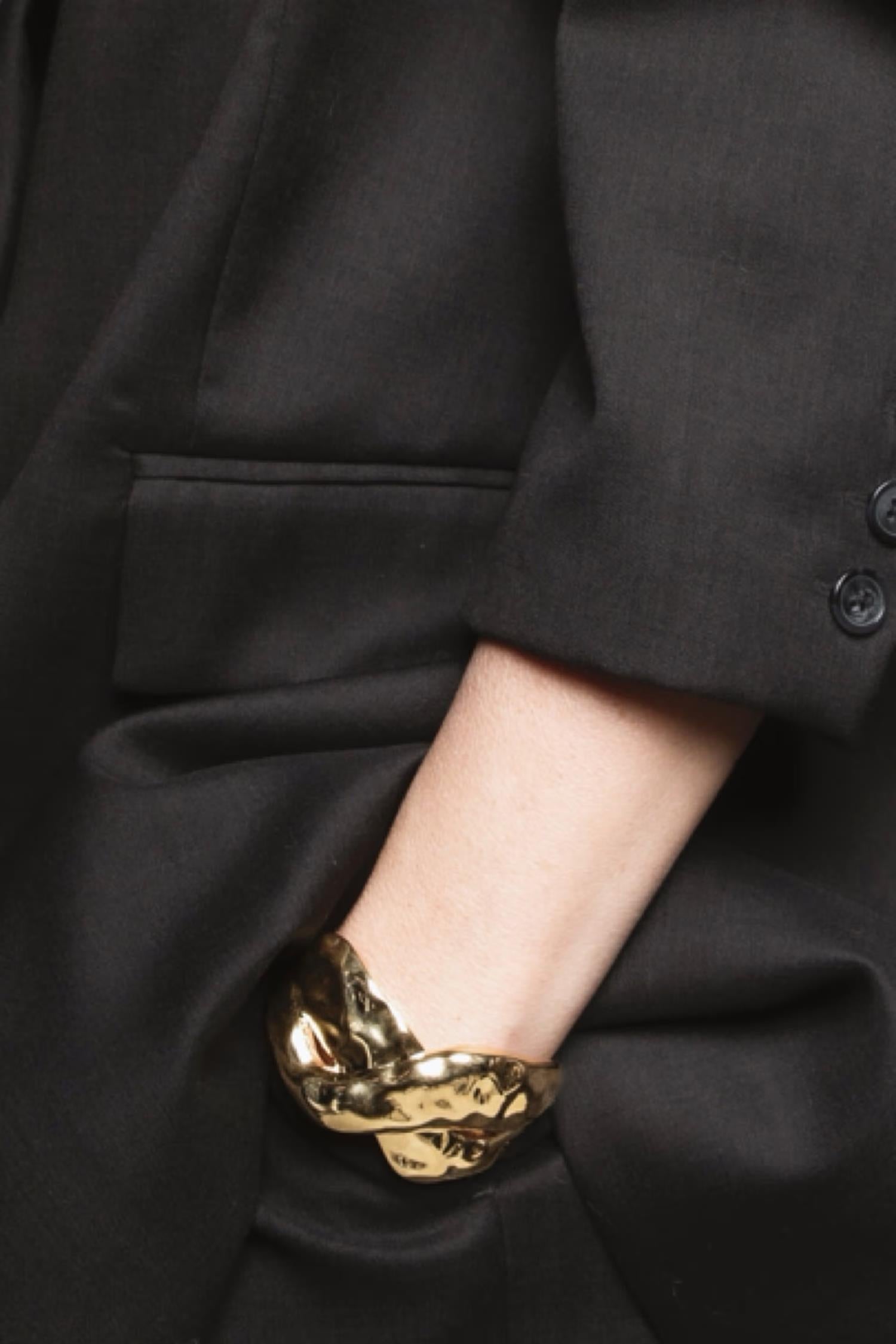 The Grand er et dristig armbånd med en organisk hamret tekstur, laget i 14K gull PVD-belagt rustfritt stål. Det stilrene, men iøynefallende designet gjør det perfekt for å skape et statement og tilføre antrekket et eksklusivt preg. Smykket er allergivennlig, 100 % nikkelfritt og passer selv for sensitiv hud.