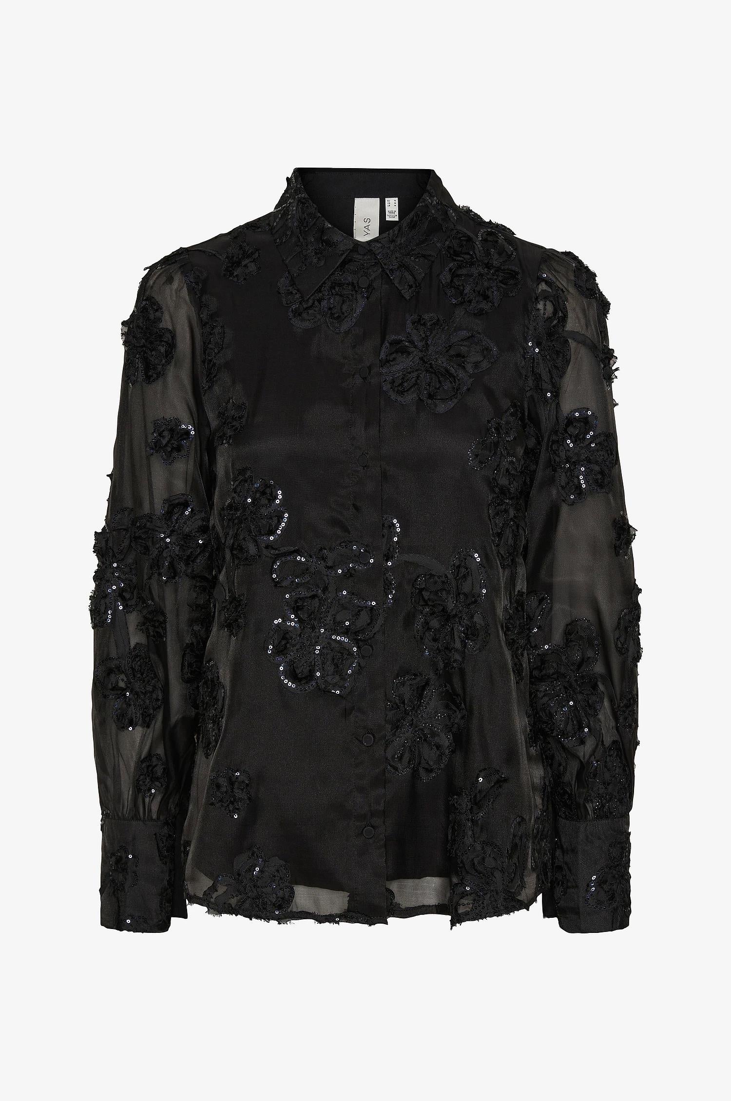Blusen har en rett passform og er laget i lett, vevd chiffon med blomstrete applikasjoner og broderte paljetter som gir et subtilt, sofistikert uttrykk. Den har liten skjortekrage, kledde knapper foran og bobleermer med brede mansjetter for et elegant preg. Blusen er fôret for komfort og gjør den enkel å style til både hverdag og fest.