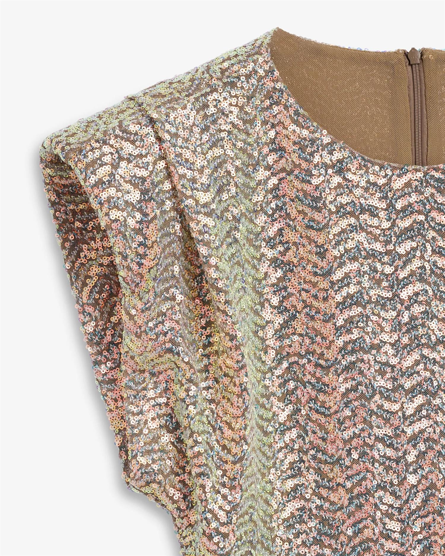 Sunset Sequin Top fra Iben kombinerer tidløs eleganse med moderne partyglans. Toppen har en løs, lett passform som draperer seg elegant over kroppen, og korte ermer som gir et subtilt, sofistikert uttrykk. Den er dekket av glitrende paljetter som reflekterer lys og skaper en luksuriøs, festlig look.
