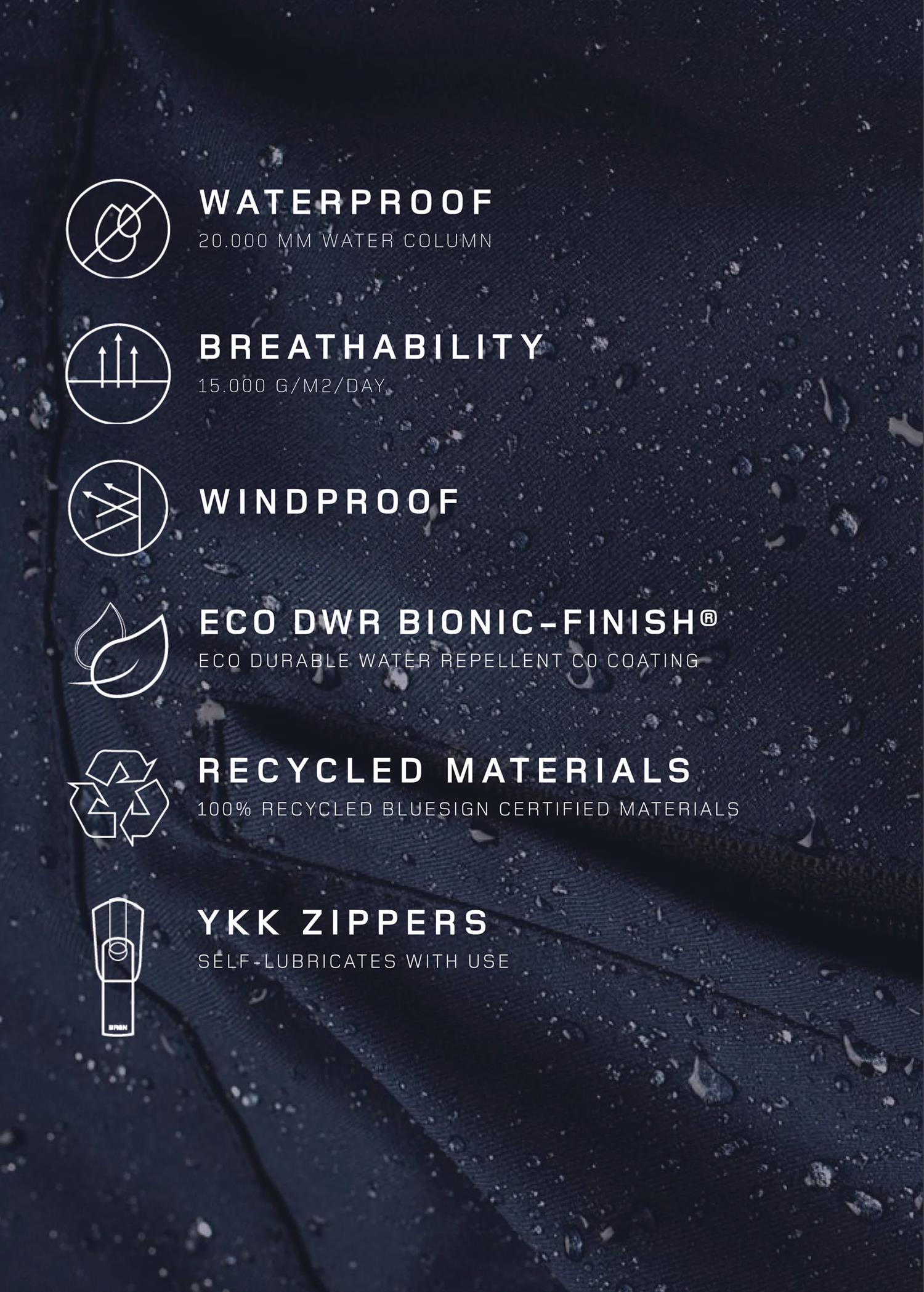 Jakken har en vannsøyle på 20 000 mm, er vindtett og pustende, og takler kraftige regnbyger med ease. Den gir god beskyttelse gjennom våte høstdager og kjølige vårdager, samtidig som materialet sørger for komfort gjennom hele dagen. Rossby Coat kombinerer minimalistisk, skandinavisk design med gjennomtenkte detaljer for hverdagsbruk.