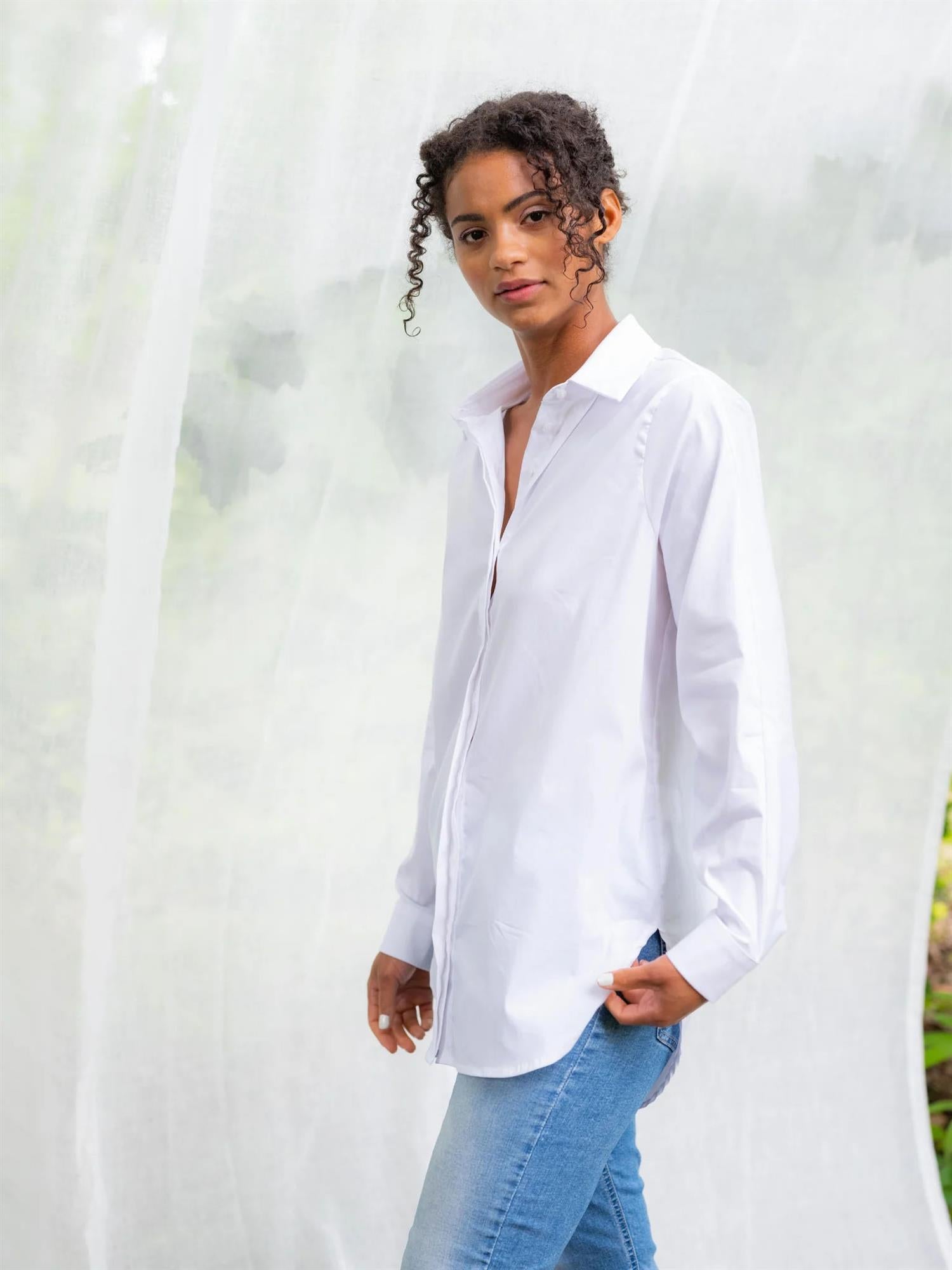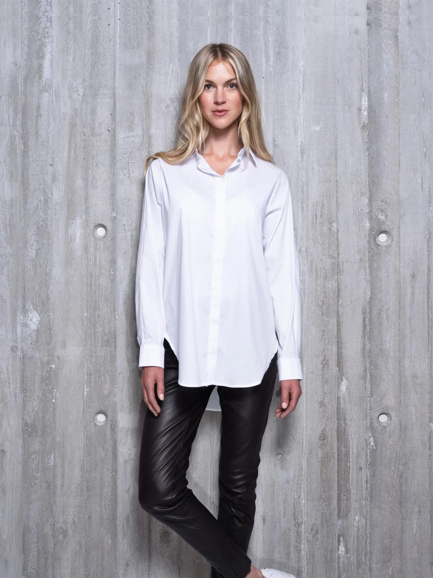 Snow er en oversized skjorte i rett fasong og med klassisk krage. Den har avrundet endekant og mansjett med knapper. Det perfekte baseplagg du må ha i din garderobe! Normal i størrelsen.