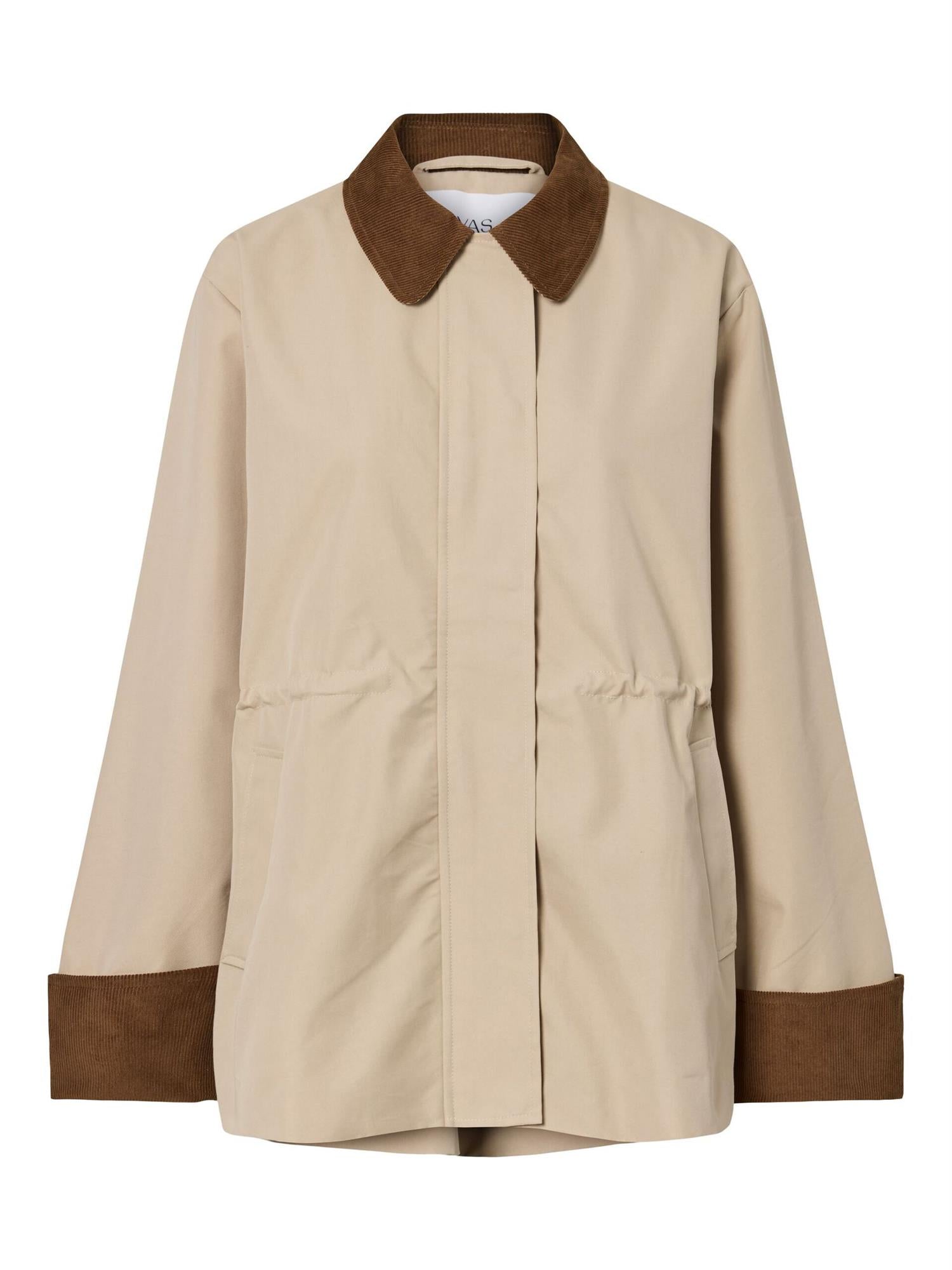 Farge: Beige / sand med brun krage og mansjetter i kordfløyel.