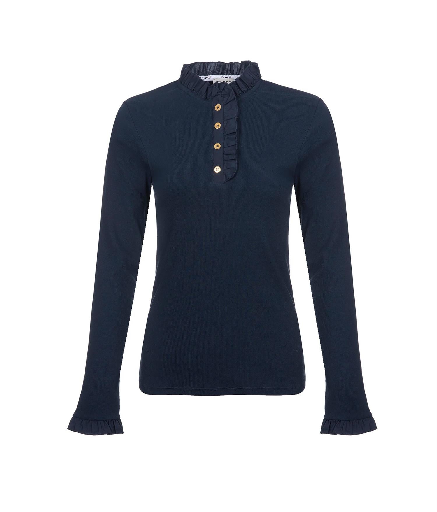 Flory har delikate rysjer og elegante gullknapper som gir et eksklusivt og gjennomført uttrykk – perfekt når du ønsker en klassisk base med det lille ekstra.